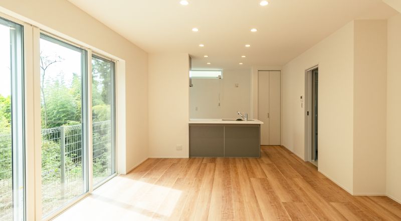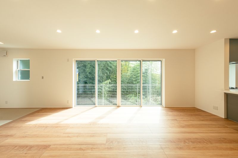 こちら、リビングからの眺め。やわらかな陽光と緑が映える、木質感あふれるスペース。
